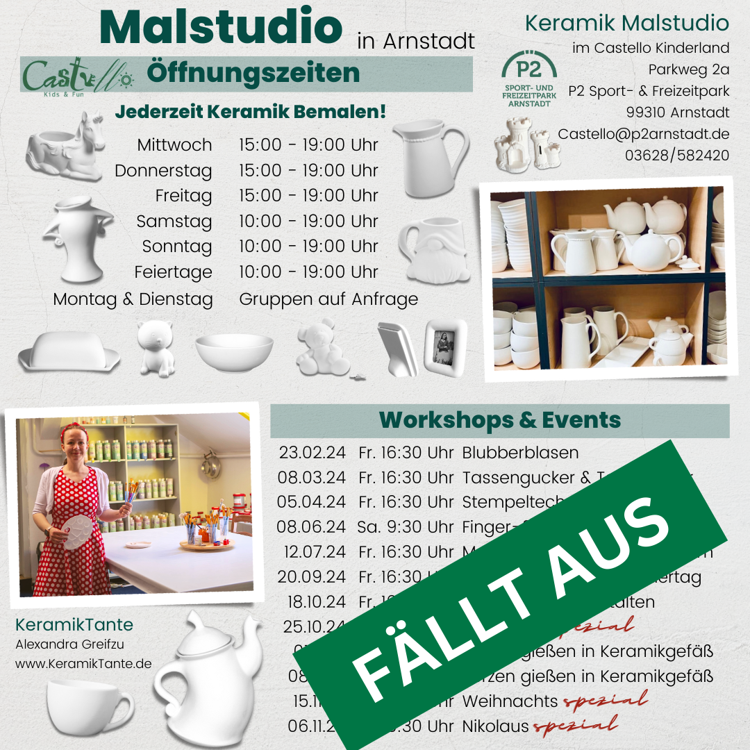Dabei ist die Nutzung des Indoorspielplatzes und Keramik Malstudios auch außerhalb der Öffnungszeiten möglich. Schreibt uns gern eine Mail an Castello@p2arnstadt.de.